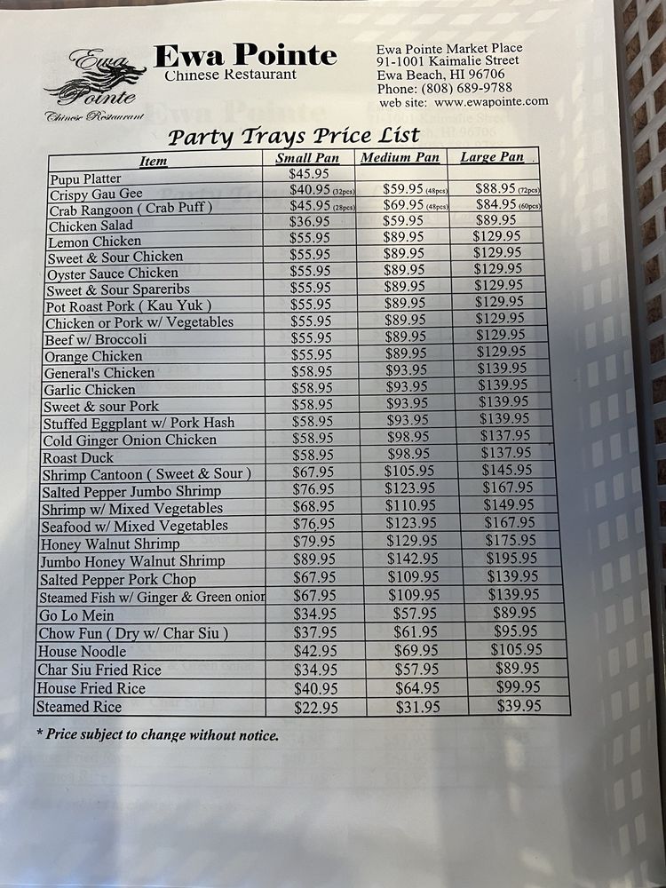 Introducing the menu at Ewa Pointe Chinese Restaurant, located in Ewa Beach, HI. This Chinese cuisine spot offers a variety of delicious options for both vegetarians and meat lovers. From their Salted Pepper Chicken Spicy to the savory Hot & Sour Soup, each dish is carefully crafted with bold flavors. Their Chicken Salad and Crispy Gau Gee appetizers are perfect starters before diving into their delectable main courses. Ewa Pointe is not just a place to eat but an experience for your taste buds. The restaurant also offers convenient amenities like delivery, takeout, and catering services. Whether you're dining in with friends or ordering a feast to enjoy at home, Ewa Pointe Chinese Restaurant delivers exceptional service and authentic Chinese flavors.